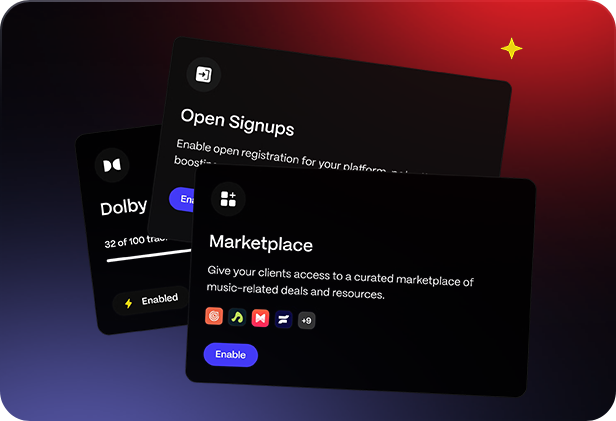 Easily manage client integrated features, offering tools like Feature FM Smart Links, AI mastering, Dolby Atmos, and our marketplace access. Provide tailored services to boost client satisfaction and retention.